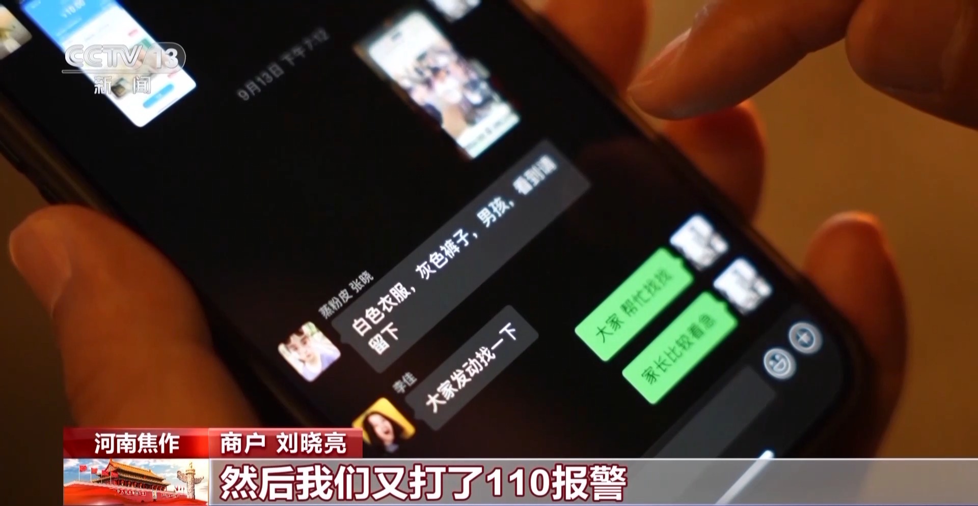 商户 刘晓亮:防止小孩跑到外边去,然后又打了110报警,我让妈妈把孩子照片给调出来,发到了我们的两个工作群、让我特别感动的是,现场有很多热心群众,热心游客拿着手机出来拍了小孩的照片,都去四处奔跑去找这个小孩。