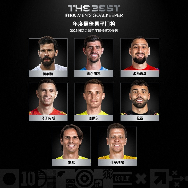 阿利松(利物浦)、索默(国米)、多纳鲁马(巴黎/曼城)、马丁内斯(维拉)、库尔图瓦(皇马)、诺伊尔(拜仁)、拉亚(阿森纳)、什琴斯尼(巴萨)
