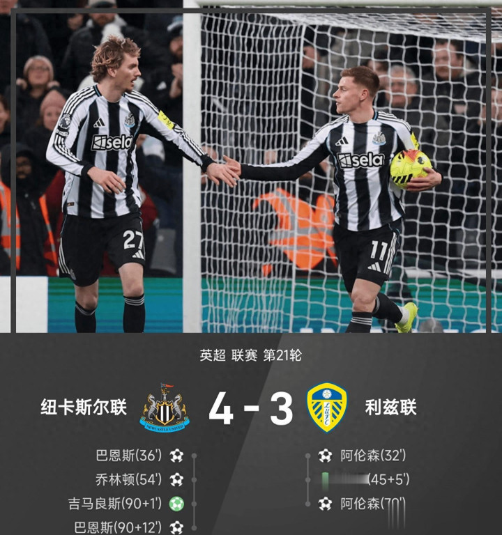 下半场比赛,第55分钟,吉马良斯外脚背撩传,乔林顿头球破门,纽卡2-2利兹联,第64分钟,有如神助!舍尔、沃尔特马德近距离两连击,佩里两连扑救主,第67分钟,波普出击失误送空门,贾斯汀头球击中横梁,勒温补射踢空,第79分钟,又滑倒!阿伦森抽射反角破门,利兹联3-2再度领先纽卡,伤停补时,90+1’阿伦森手球送点,吉马良斯主罚破门扳平比分,纽卡3-3利兹联,伤停补时90+12读秒绝杀!!巴恩斯转身抽射破门,纽卡4-3利兹联,全场比赛纽卡4-3绝杀利兹联。